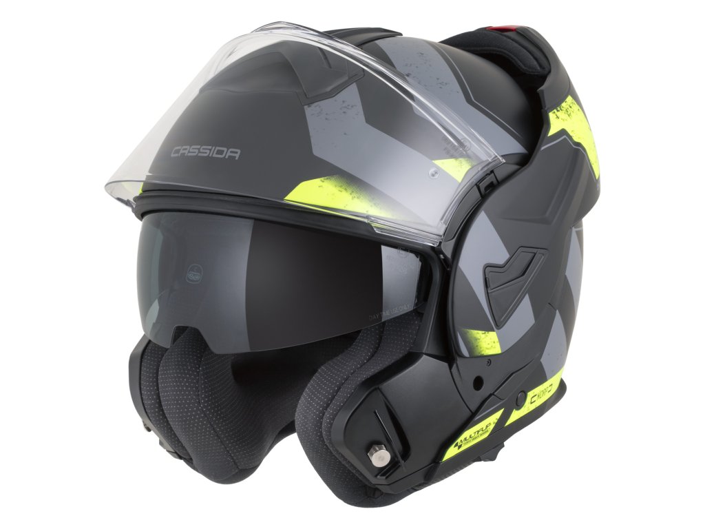 Prilba CASSIDA Multiflip je cestovný model vyklápacej prilby s plastovou škrupinou a štandardmi prilieb vyššej strednej triedy.