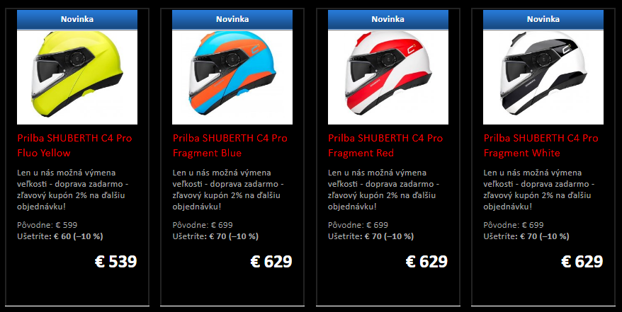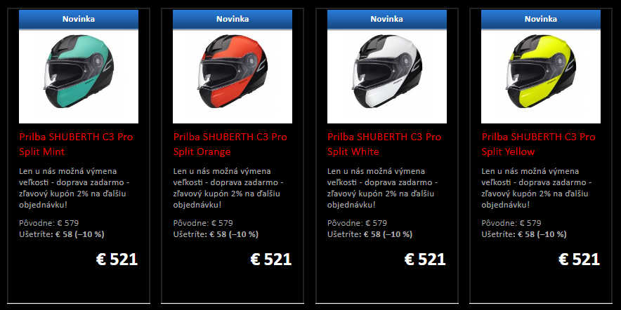 - Medzi obľúbené a časom preverené prilby SCHUBERTH C3 PRO pribudli 4 nové grafické kombinácie SPLIT no tento krát za nové nižšie ceny. Opäť sa do ponuky vracia aj pri tomto modely jej ekonomické verzia SCHUBERTH C3 BASIC.